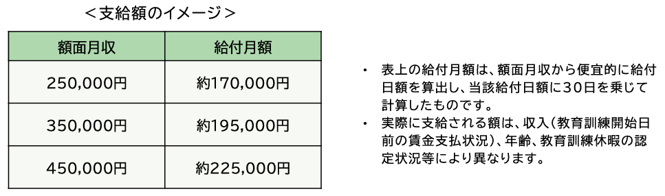 ※4 教育訓練休暇給付金の給付日額は、原則として、休暇開始日前6ヶ月の賃金日額に応じて算定されます。その支給額のイメージは、下記の表のとおりとされています。